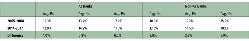 From left to right, Table 1 can be interpreted as average RBC ratios on the low end and high end (25th to 75th percentile) for ag and non-ag banks. It is clear that ag and non-ag banks have consistently built capital through external sources and retained earnings since the financial crisis, contributing to a moderate increase in their RBC ratios. In addition, average RBC ratios at both types of banks are well above the minimum threshold to qualify as well-capitalized (8 percent) during both time periods.