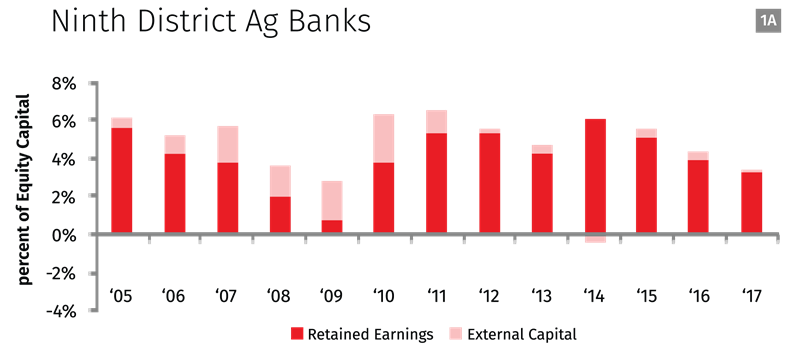 The figures illustrate that the 2008 financial crisis had a larger impact on non-ag banks, which show three consecutive years of negative retained earnings, whereas retained earnings for ag banks remained positive during the same period. Despite adverse pressure on earnings, the contribution to capital from external sources expands under stress for non-ag and ag banks alike and offsets the reductions in capital caused by the extreme losses for non-ag banks. 3 Both types of banks demonstrated an ability to raise capital from external sources during a period of stress.