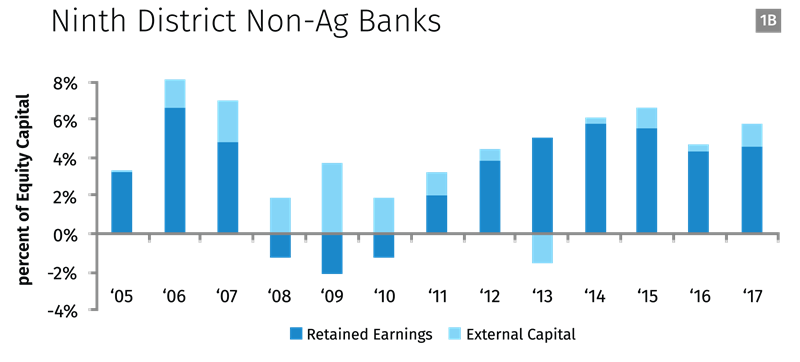 Banks build capital from two primary sources, external capital and retained earnings. External capital sources consist of transactions that involve capital and Treasury stock or other shareholders (e.g., a bank raises capital through the issuance of new bank stock). Retained earnings are the bank’s net income remaining after dividends are paid to shareholders. Banks usually report positive net income and therefore are in a position to grow capital and pay dividends. However, when banks lose money (negative net income), capital levels decrease unless external sources are able to offset losses. Figures 1a (ag banks) and 1b (non-ag banks) illustrate on an annual basis how banks have built capital in recent years using these two primary sources of capital formation.