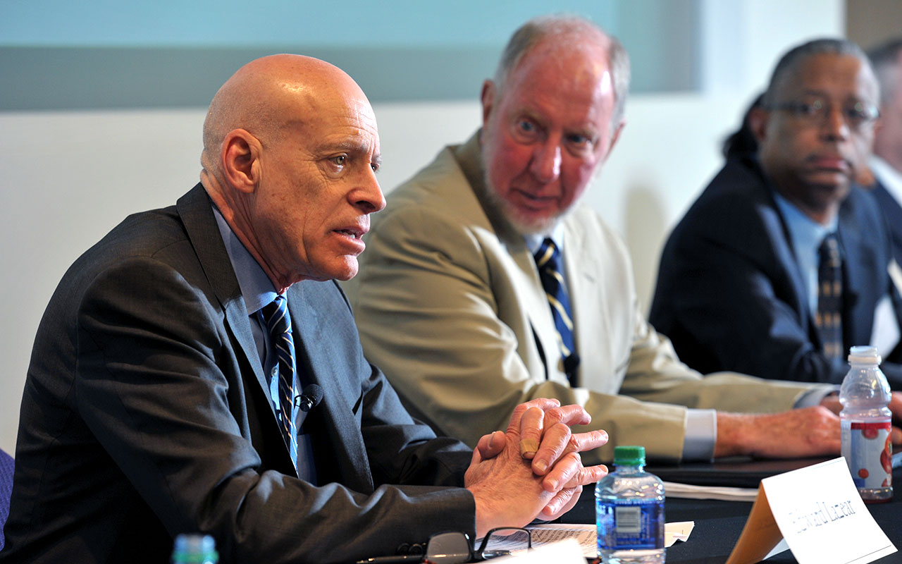 Edward Lazear speaks during the day 1 morning panel while Robert Putnam and William Spriggs look on.