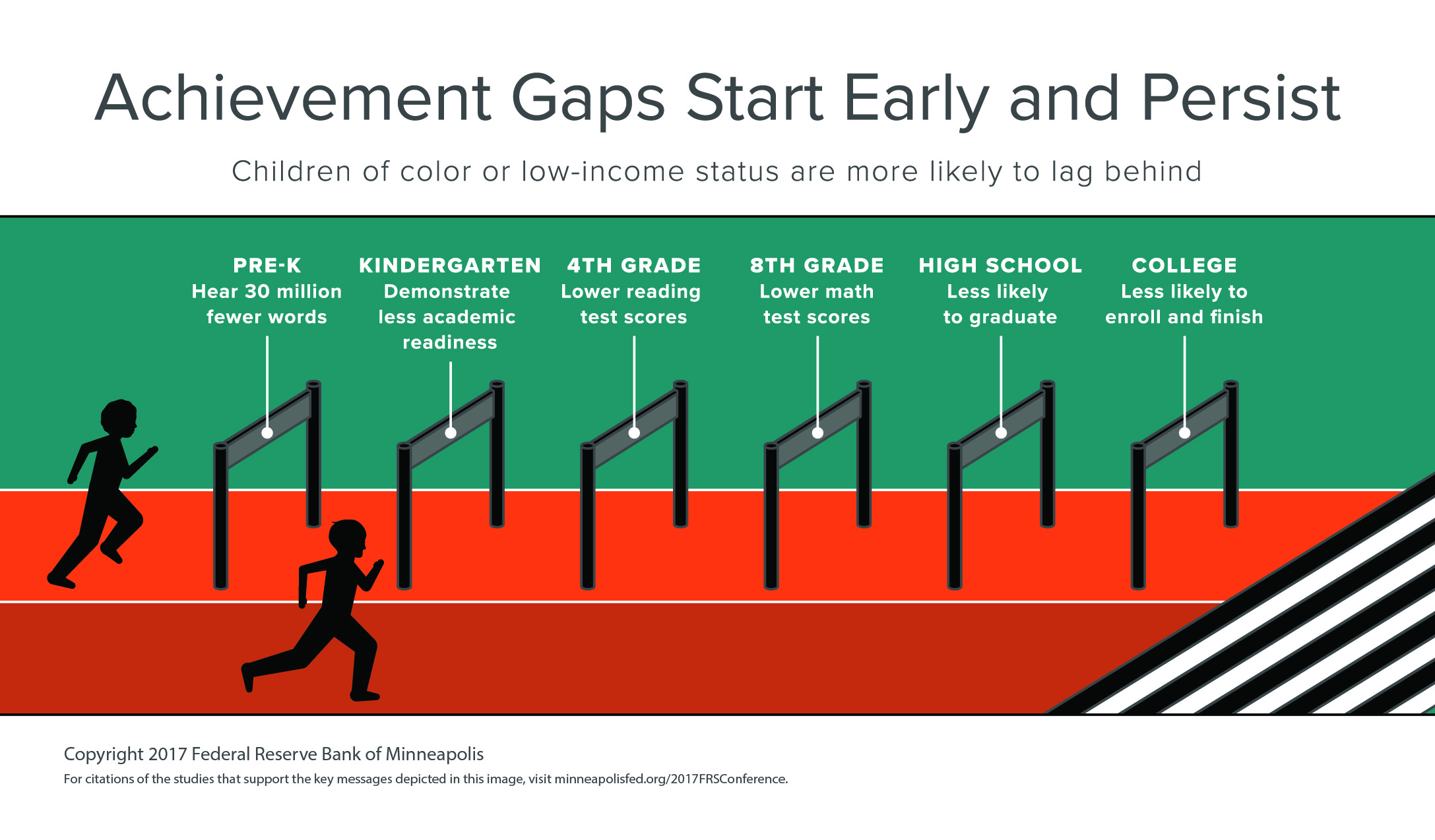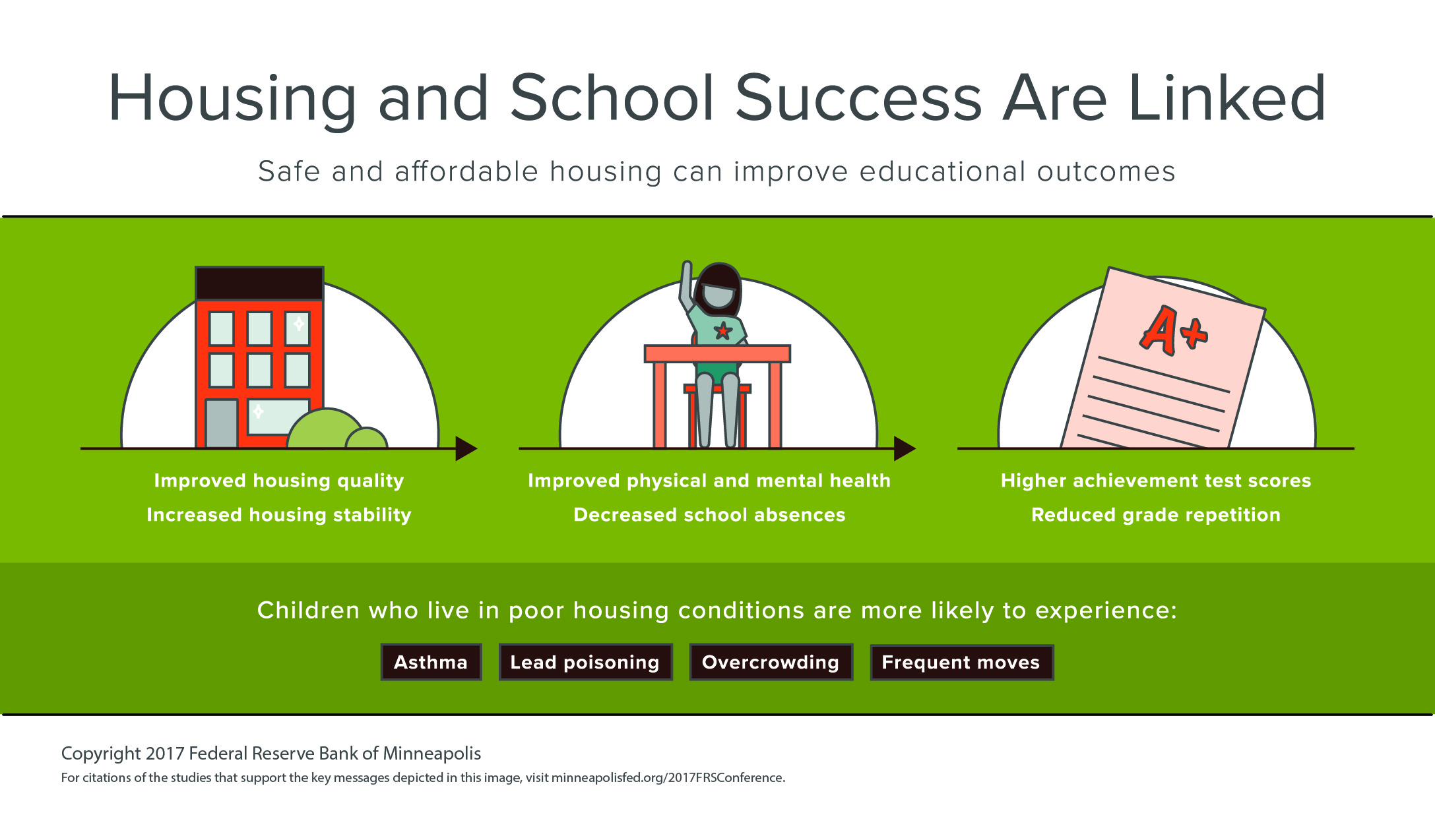 The 2017 Federal Reserve System Community Development Research Conference explored the intersections between child and youth development, community development, and economic well-being, with a particular focus on factors that affect low-income kids and communities. To help communicate some of the conference's key concepts, the Federal Reserve Bank of Minneapolis worked with Burness Communications to develop a set of six infographics that depict the important roles that early childhood development and community development play in shaping economic opportunity.