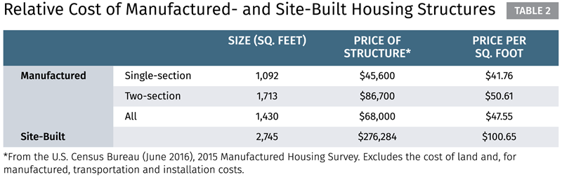 Low cost is the most obvious advantage of a manufactured home. As shown in Table 2, the cost per square foot of a manufactured home is estimated to be about half or less that of a site-built structure. Excluding land, a 1,700 square-foot structure, for example, could be built for about $86,000 in a factory (assuming two-section construction) as opposed to about $171,000 on-site.